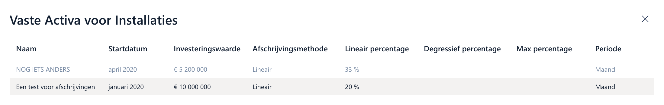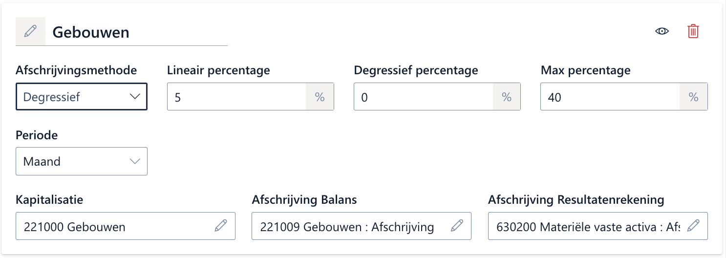 Kies per activum in welke categorie je de activa wil onderbrengen. Pas indien gewenst de afschrijvingsmethode, percentage(s) en periodiciteit aan.