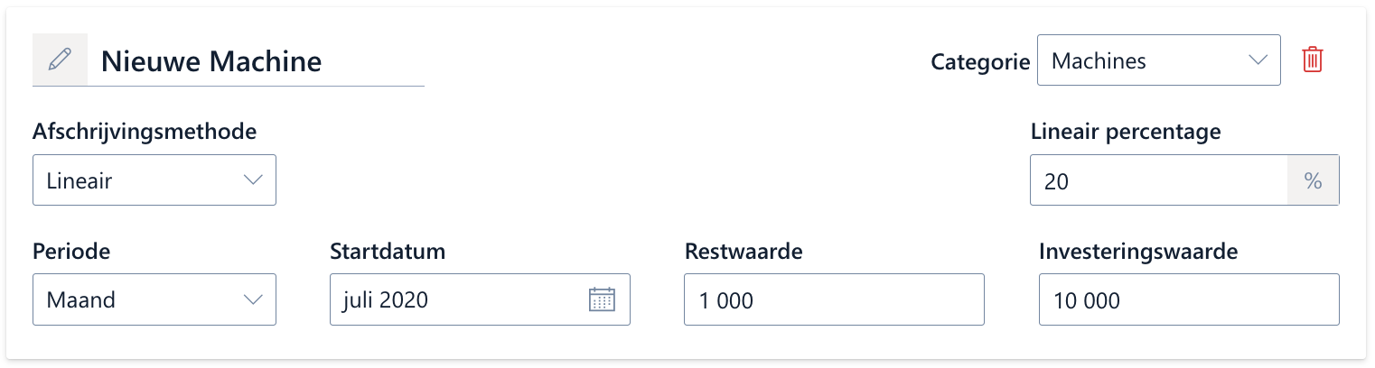 Een machine wordt gekocht voor €10.000 en heeft een verwachte levensduur van 5 jaar. De geschatte restwaarde na die 5 jaar is €1.000.